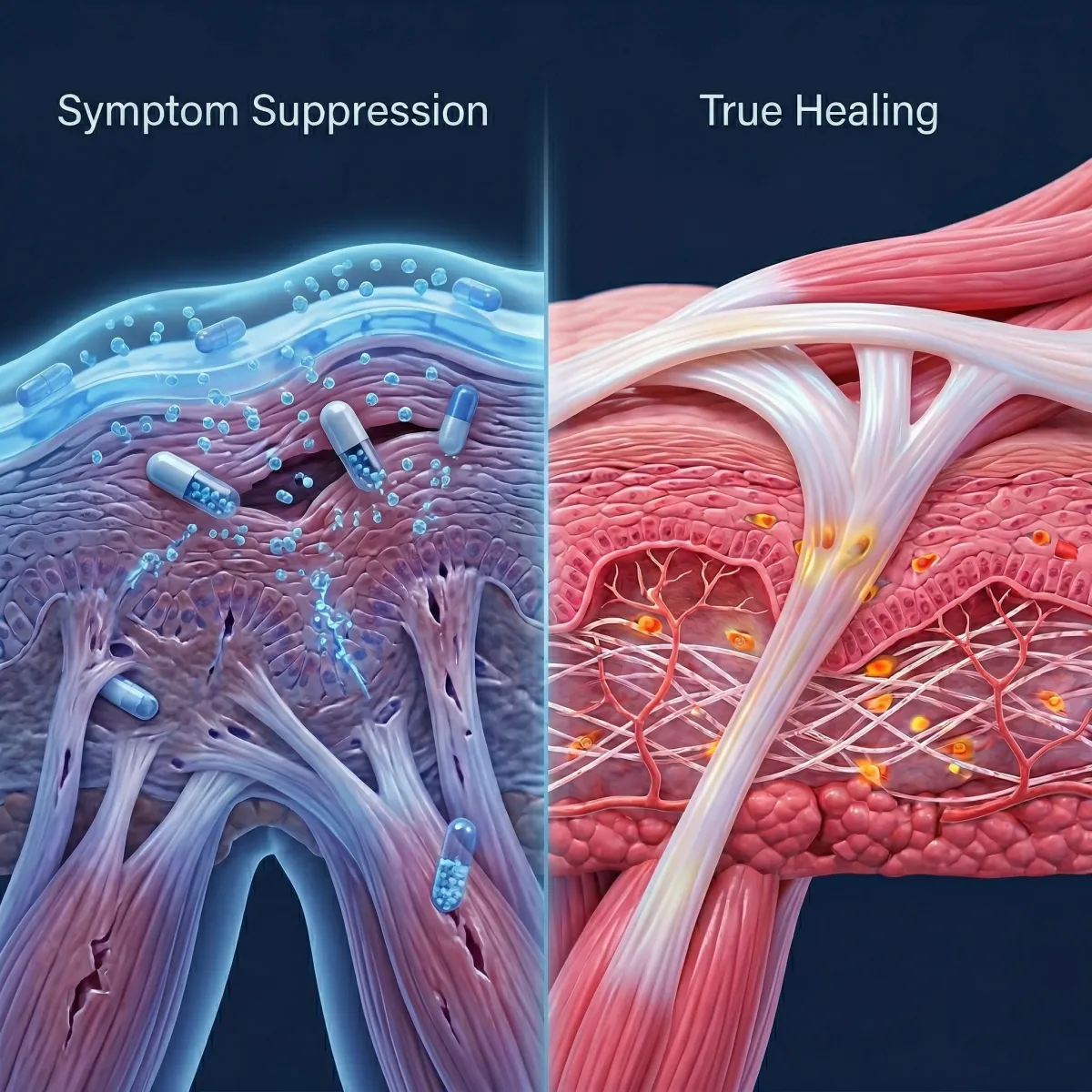 Most conventional treatments like steroid injections, anti-inflammatory drugs, and sometimes even surgery, are not designed to address root causes. Their primary purpose is symptom suppression.